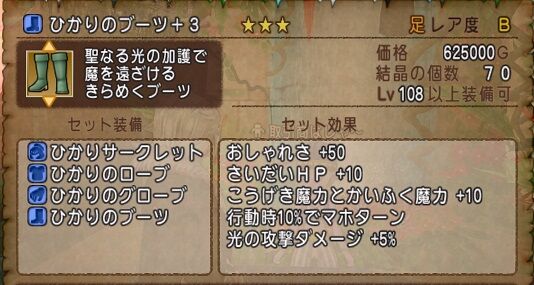 ひかりセットに比べると攻撃魔力が34違いますが、何と言ってもメラ系のダメージが増加するソポスが優秀です。呪文発動速度2%も嬉しい効果。