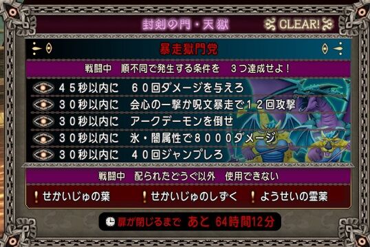 2021/03/30 3/30 天獄開きました!~暴走獄門党~ こんにちは!トワです(^_-)-☆天獄があきました!今回のボスは【暴走獄門党】■必要耐性■・呪文ダメージ減・ブレスダメージ減条件は、4/1(木)23:59まで!神ベルトGETできるといいですね応援クリックお願いします!人気ブログランキング 「情報」カテゴリの最新記事 < 前の記事次の記事 >