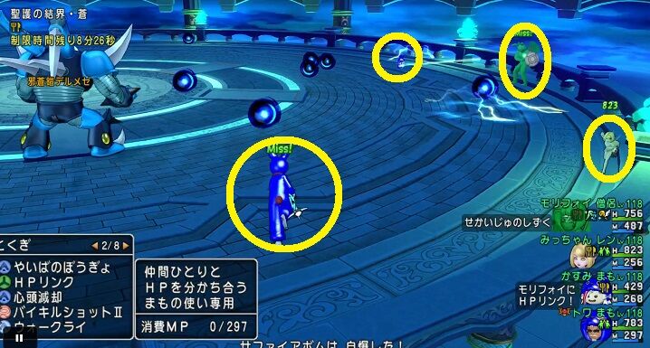 ベホマラーやしずくはある程度広めな範囲ですが、それ以上にヒーラーから離れすぎると回復が届きません。