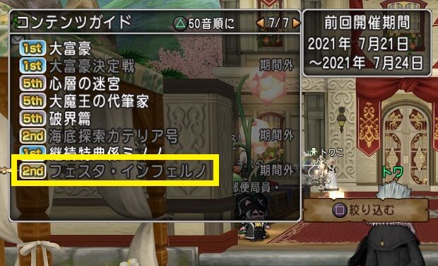 ❶コンテンツガイドを選び、追加順でソート(PS4だと△ボタン)して、ページ最後にある「フェスタ・インフェルノ」を選んで飛ぶ。