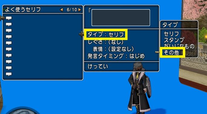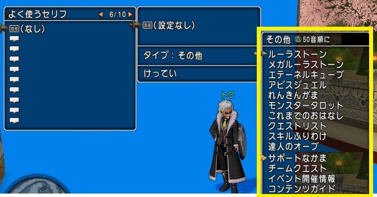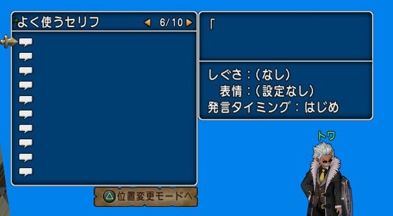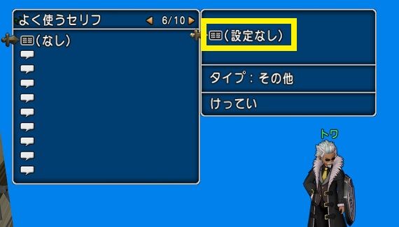 (さくせん→いろいろ設定→コミュニケーションの設定→よく使うセリフ設定→セリフ内容変更)